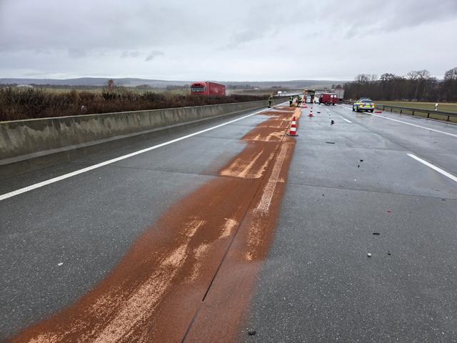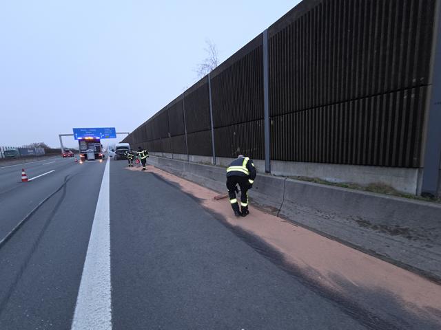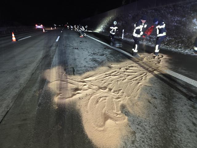 Moment ausweichen. Obwohl die um 12:33 Uhr allarmierten Einsatzkräfte den nachfolgenden Verkehr von der Anschlussstelle Dittersdorf her zurückhielten, konnte nicht verhindert werden, dass ein noch davor fahrender Lastzug offenbar nahezu ungebremst in den falschherum stehenden Transporter krachte. Der Fahrer des Kleinlasters konnte zuvor irgendwie noch das Fahrzeug verlassen, eine Entscheidung die ihn sicher sein Leben rettete. Über alle Fahrspuren waren nicht nur Trümmer, sondern vor allem auch große Mengen Betriebsmittel und Motorenöl verteilt. Mit insgesamt 18 Sack Ölbindemittel reinigten die Kameraden der Schleizer Feuerwehr die linke Fahrspur, damit nach ca. 40 Minuten der Verkehr wieder einspurig am Unfallort vorbeigeführt werden konnte. Nach über 2 Stunden kam dann die angeforderte Firma zur Reinigung der anderen Fahrspuren, die dann die Unfallstellensicherung der Feuerwehr übernahm. Nach 5 Stunden war die Feuerwehr wieder komplett einsatzbereit. |