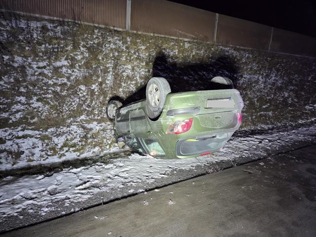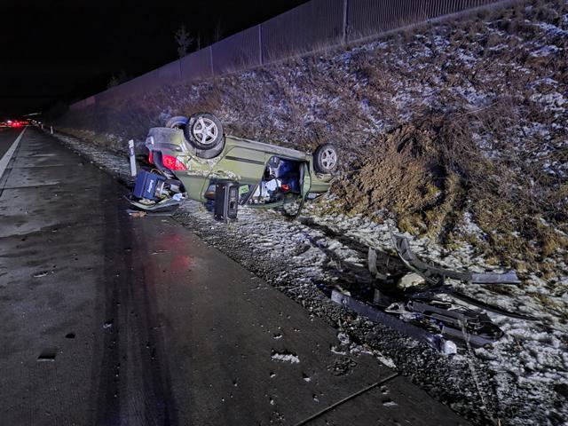 | Pkw Peugeot kracht zwei Mal in die Mittelleitplanken, dann in den Hang und bleibt qualmend auf dem Dach liegen | |||