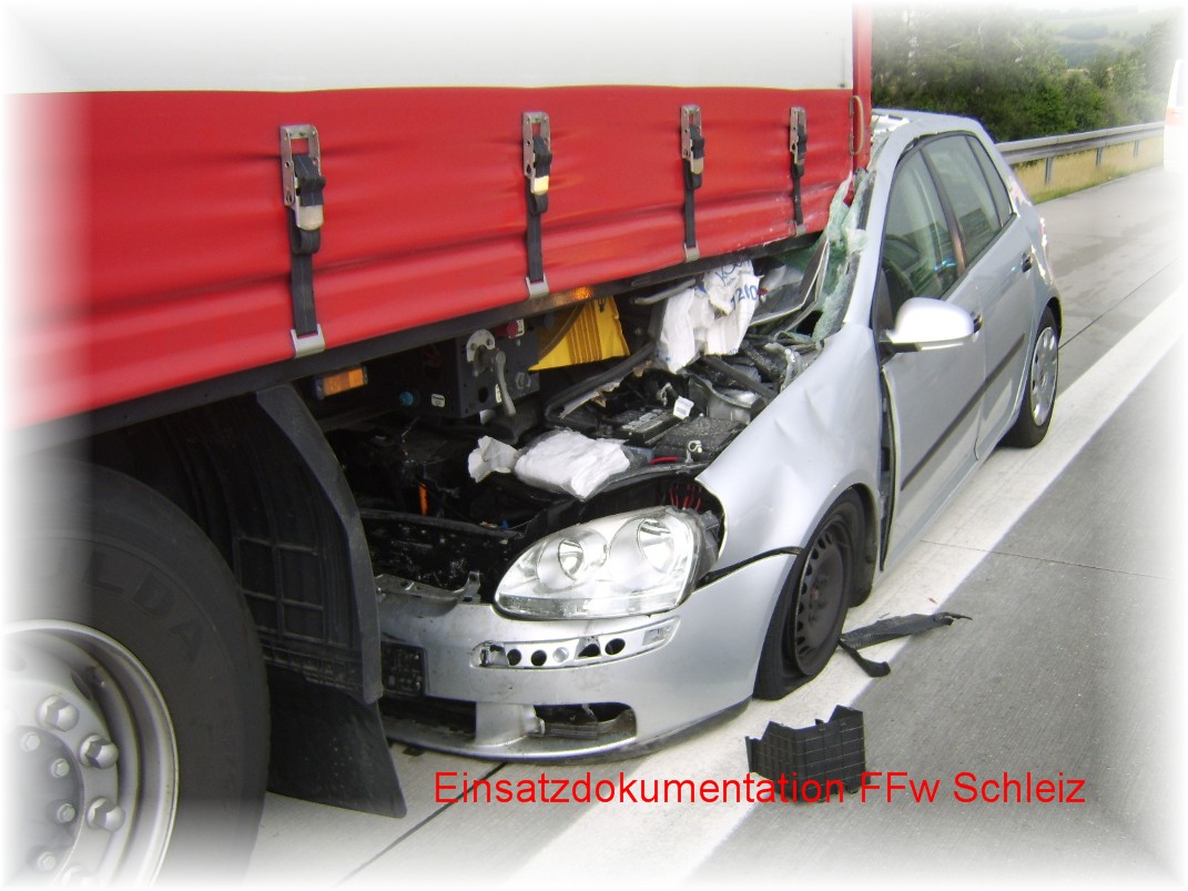 | 13.07.2006 Es ist 09:19 Uhr an einen ganz gewöhnlichen Donnerstag mitten im Sommer und die Luft ist erdrückend schwül. Währenddessen die meisten ihre Arbeit verrichten, alarmiert die Rettungsleitstelle Saalfeld die Freiwillige Feuerwehr ins Schleiz zu einen Lkw- Brand auf die Bundesautobahn 9 km 222,6 Richtung Nürnberg. Schnell werden die Einsatzfahrzeuge besetzt, mit Sondersignal fahren die Fahrzeuge über die Anschlussstelle Dittersdorf zum Einsatzort. Beim Eintreffen der ersten Einsatzkräfte kann aber schnell Entwarnung gegeben werden, das Feuer ist bereits gelöscht. Dafür zeichnet sich ein neues Problem ab. Der linke Tank der Sattelzugmaschine ist beschädigt, Diesel läuft ins Erdreich. Erste Sicherungsmaßnahmen werden eingeleitet, währenddessen die GW-G 2 aus Schleiz nachgefordert wird. Ca. 200 Liter des Kraftstoffes sind bereits ins Erdreich der angrenzenden Bankette verschwunden, die restlichen 100 Liter können die Einsatzkräfte auffangen. Mit einer Notreparatur unterstützen die Schleizer Kameraden die rasche Beräumung des Ereignisortes, die Zugmaschine kann samt Auflieger auf den nahe gelegenen Parkplatz fahren. Nicht nur die Polizei, sondern auch die Autofahrer auf der Autobahn werden es den Schleizer Kameraden danken. Ursache für den Unglücksfall war eine nach oben geschleuderte Halterung eines Hemmschuhes, jene wohl ein vorausfahrendes Fahrzeug verloren hatte. Diese durchschlug den Fahrzeugtank und der auslaufende Diesel entzündete sich. Geistesgegenwärtig löschte der Fahrer unmittelbar nach dem Vorfall das Feuer. Das Umweltamt war vor Ort, die Bankette muss auf mehrere Meter abgetragen und erneuert werden. Gegen Mittag sind alle Fahrzeuge wieder Einsatzbereit an ihrem Standort. Um 16:12 Uhr ertönen erneut die Alarmmeldeempfänger der Schleizer Kameraden. Nicht das herumkreisende Unwetter war dafür schuld- nein- erneut kam es zu einem Ereignis auf der Bundesautobahn. Wieder war die Richtungsfahrbahn Nürnberg betroffen, diesmal sollte aber Schlimmeres passiert sein. Am Kilometer 226,5 war eine Pkw- Fahrerin unter einen Sattelauflieger gekracht. Die Hälfte des Pkw war unter dem Auflieger verschwunden (2 Meter). Die Pkw- Fahrerin wurde bereits vor dem Eintreffen der Schleizer Einsatzkräfte vom Rettungsdienst mit leichten Verletzungen befreit, das grenzt allerdings schon an ein Wunder, wenn man die Bilder betrachtet. Die eigentliche Rettung für die Pkw- Fahrerin war wohl der Unterfahrschutz des Aufliegers, der den größten Teil der Aufprallenergie aufnahm. Den Schutzengel sollte die Frau inzwischen beim Namen kennen, weitere Insassen hätten diesen Horrorcrash nicht überleben können. Der Einsatz für die Schleizer und Triptiser Kameraden konnte durch die Schleizer Wehrführung vor Ort abgebrochen werden. |