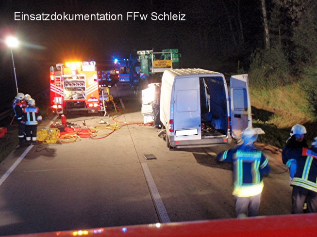 01:34 Uhr Eigentlich hatten die Kameraden in den letzten Stunden ausreichend Beschäftigung mit Dieselspuren auf drei Bundesstraßen und einer Landstraße rund um Schleiz. Bereits ab 17:45 Uhr waren sie dafür unterwegs, bis spät in die Abendstunden hinein. Nach Herstellung der Einsatzbereitschaft der gesamten Technik, einem gemeinsamen Abendbrot und einer kurzen Besprechung waren alle gegen Mitternacht zu Hause. Doch die Nachtruhe hielt nicht lange an. Um 01:34 Uhr schrillten erneut die Alarmmeldeempfänger der Schleizer Kameraden. Ein schwerer Verkehrsunfall war zwischen den Anschlussstellen Dittersdorf und Triptis gemeldet worden. Am Einsatzort bot sich den heraneilenden Einsatzkräften wieder einmal ein schreckliches Bild. Zum Glück war der Fahrer noch ansprechbar und konnte über seine reichlichen Beschwerden berichten, ein enormer Vorteil für die Rettungskräfte vor Ort. Blitzschnell wurden Fahrzeuge und Aggregate für die Rettung vorbereitet, währenddessen andere Einsatzkräfte mit der Einsatzstellensicherung und Beleuchtung beschäftigt waren. Wie der Fahrer später selbst bestätigte, war er kurz eingenickt und ungebremst mit seinem Mercedes Sprinter auf einen gerade wegen einer Panne auf der rechten Fahrspur abgestellten Sattelschlepper aufgefahren. Das Metall des Kleintransporter verschob sich auf der gesamten Front weit in den Fahrgastraum. Im Brust - und Beinbereich war der Fahrer stark eingeklemmt. Auf Grund der Verletzungen und dem Verdacht einer Wirbelsäulenfraktur entschieden die Notärztin zusammen mit der Einsatzleitung den Patienten nach ersten Stabilisierungen patientenschonend zu retten. Mit äußerster Sorgfalt gingen die Einsatzkräfte vor und zogen mittels Seilwinde zunächst komplett das Fahrzeug um ca. 1,5 m zurück, da der defekte Sattelschlepper sich nicht mehr rührte. Zwei hydraulische Rettungsspreizer, ein hydraulischer Rettungszylinder und zwei hydraulischer Scheren wurden unter mühevoller Kleinarbeit eingesetzt, um den Fahrer behutsam aus seiner misslichen Lage zu befreien. Die Kombination von verformten Blechen, Trägern und allerhand Plastteilen machte die Arbeit der vorgehenden Einsatzkräfte nicht gerade einfach. Besondere Fähigkeiten und Kombinationsgabe müssen die Kameraden in solchen Fällen beweisen, da die unterschiedlichen Möglichkeiten der Fahrzeugverformungen sich in Ausbildungen und Übungen kaum simulieren lassen. Erfahrung und maßvolle Ruhe sind dabei ein Meilenstein des Erfolges. Die Grundidee in der technischen Rettung ist oft gleich. Alle verschobenen Teile wie Bleche, Träger, Armaturenbrett, Lenkrad und auch Aggregate müssen zurück in Richtung ihrer Ausgangslage oder darüber hinaus gedrückt oder auch gezogen werden. Spreizkräfte von bis zu 100 Tonnen sind gefragt, obwohl man meist ganz eng am Patienten arbeitet. Trotz Dramatik gefühlvoll mit dem rund 22 kg schweren Spreizer arbeiten, sich nicht aus der Ruhe bringen lassen, Zentimeter für Zentimeter Freiraum schaffen und das teilweise bis zu einer Stunde lang, genau das war auch bei dieser Rettung der Erfolg der vorgehenden Einsatzkräfte. Ein angeforderter Rettungshubschrauber konnte auf Grund starkem Nebels nicht aufsteigen. Daher wurde der Patient nach der erfolgreichen Rettung umgehend mit einem RTW ins Klinikum nach Jena gefahren. Die Bergungsarbeiten konnten zügig dank der guten Zusammenarbeit von Polizei, Feuerwehr sowie dem Abschleppdienst vorangetrieben werden. Trotzdem war der Autobahnabschnitt über 2 Stunden voll gesperrt. Die Freiwillige Feuerwehr Schleiz war gegen 06:00 Uhr wieder komplett einsatzbereit an ihrem Standort. Die Nacht war damit auch vorbei, wieder einmal freiwillig, aber auch für einen guten Zweck. Die erfolgreiche Rettung war hierbei der selbst organisierte Dank für die Einsatzkräfte. Die Einsatzleitung der Schleizer Feuerwehr bedankt sich bei allen anwesenden Einsatzkräften von DRK, Feuerwehr, Polizei sowie der Notärztin für den reibungslosen Einsatzablauf und die erfolgreiche Arbeit. |