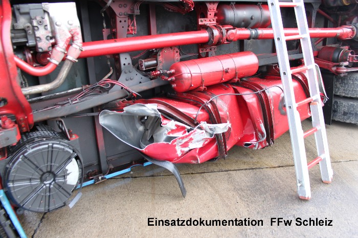 Einsatz FFw Schleiz am 09.09.2011, Alarm 07:22 Uhr Wenn die Autobahn 9 durch die Rennstadt Schleiz rollt dann ist meistens Freitag und es hat wieder einmal mächtig gekracht. So auch diesmal wieder, gleich hinter der Anschlussstelle Dittersdorf in Richtung Triptis. Nachdem ein Kleintransporter aus bisher unbekannter Ursache auf die Bankette der Überholspur kam, kollidierte er seitlich mit einem Lastzug. In dessen Folge kam der Hängerzug ins Schlingern und durchbrach zusammen mit dem Transporter die Mittelleitplanke, krachte auf die Seite und kippte den Anhänger komplett kopfüber auf die Leitplanke. Dabei wurden beide Fahrzeugtanks komplett aufgerissen und ca. 600 Liter Diesel liefen aus. Der Fahrer des Lastzuges wurde bei diesem Unfall leicht verletzt. Glück für alle, denn im Gegenverkehr der viel befahrenen Bundesautobahn konnten alle diesem Monstrum noch ausweichen und die beiden Passanten des Kleintransporters kamen auch mit dem Schrecken davon. Der Einsatz von neuster Feuerwehrtechnik (einem Plasmaschneider) kombiniert mit der Seilwinde des Rüstwagens sorgte dann noch für Beifall der staugeplagten Autofahrer, die Dank guter Zusammenarbeit von Polizei und Feuerwehr wesentlich schneller weiterfahren konnten wie ursprünglich geplant. Bereits nach 30 Minuten war die erster Fahrbahn Richtung Berlin wieder frei. Die Autofahrer Richtung Nürnberg waren nach 2 Stunden auch wieder unterwegs, obwohl die Bergungsarbeiten dann über 6 Stunden dauerten. 35 Sack Ölbinder wurden für die Beseitigung des auf den Fahrbahnen verteilten Diesel- Ölgemisches benötigt. Die Besen der Schleizer Einsatzkräfte glühten schon fast, nachdem sie über Stunden im Einsatz waren. Im Auftrag von Autobahnamt und Umweltamt muss dazu die Bankette der Richtungsfahrbahn Nürnberg saniert werden, da viel Diesel ins Erdreich gelangte. In einem naheliegenden Bach wurde zur Sicherheit eine Ölsperre gesetzt. Gegen 16:00 Uhr waren alle Fahrzeuge der Feuerwehr Schleiz wieder einsatzbereit an ihrem Standort, die Einsatzleitung bedankt sich für die gute Arbeit aller Einsatzkräfte von Feuerwehr und Polzei. |