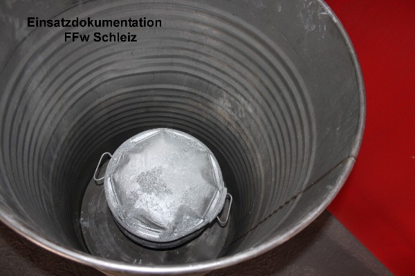 | Der Behälter wird vorsichig transportiert, weil durch die Bewegung vermutlich die chemische Reaktion beschleundigt wurde. |