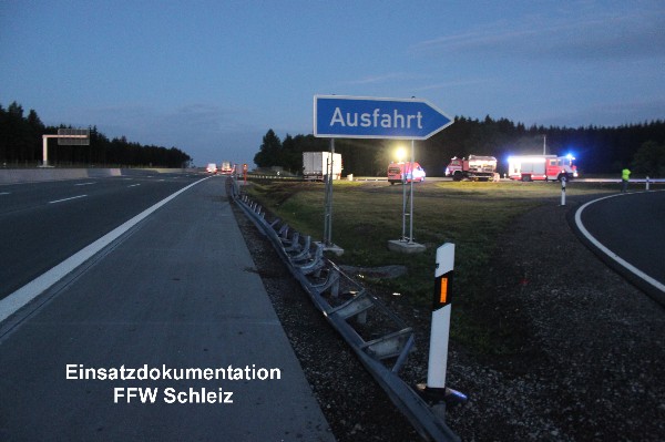 Die Nacht war für die Kameraden der Schleizer Feuerwehr wieder einmal wesentlich kürzer, als sie ursprünglich planten. Ob die Nacht des an der Autobahnabfahrt Dittersdorf von der Fahrbahn abgekommenen Lastzugfahrers dafür eher begann als er plante, das können wir nicht bestätigen - jedoch liegt es der Vermutung nahe. Das ganze Unfallbild lässt einen Sekundenschlaf als Ursache des Unfalls mit erheblichem Sachschaden vermuten. Um 2:55 Uhr wurden die Einsatzkräfte zur Anschlussstelle Dittersdorf zum auslaufenden Dieseltank nach Verkehrsunfall alarmiert. Vor Ort stand ein Lastzug quer zum Autobahnzubringer, hatte offenbar zuvor unmittelbar nach dem AUSFAHRT- Schild der Autobahnabfahrt die Leitplanke niedergewalzt und stand mit aufgerissenem Dieseltank an der Leitplanke des Zubringers. Für ein kontrolliertes Abfahren von der Autobahn hätte er paar Meter eher abbiegen müssen, vor dem Schild halt. Am Ende blieb der Fahrer zum Glück unverletzt. Die 600 Liter Dieselkraftstoff hatten sich bis zum Eintreffen der ersten Einsatzkräfte über den nächstgelegenen Straßeneinlauf ins Kanalsystem aus dem Staub gemacht und flossen bereits mit dem vorhandenen Wasser des Kanals in Richtung Regenrückhaltebecken nahe der Ortslage Moßbach. Doch dort war die Reise zu Ende. Die ersten Liter Dieselkraftstoff schafften es zwar noch ins Regenrückhaltebecken, der Rest konnte allerdings durch die Kameraden der Schleizer Feuerwehr mittels Rohrdichtkissen zurückgehalten werden. Inzwischen war der Tank zur Restleerung durch die Einsatzkräfte ausgebaut. Im Morgengrauen begann die Bergung des Lastzuges durch ein Abschleppunternehmen aus Hermsdorf und anschließend die Reinigung des Autobahnzubringers durch die Schleizer Feuerwehr. Ein aus Gera angereister Saugwagen der Firma Winkler nahm dann rund 10.000 Liter Wasser- Diesel- Gemisch aus dem Kanalsystem auf. Die Kameraden der Feuerwehr spülten dazu das Rohrleitungsnetz auf rund 2 Kilometer Länge. Bis 9:00 Uhr musste die Autobahnzufahrt in Richtung Nürnberg komplett gesperrt bleiben. Um 10:45 Uhr waren dann alle Fahrzeuge wieder einsatzbereit am Standort. |