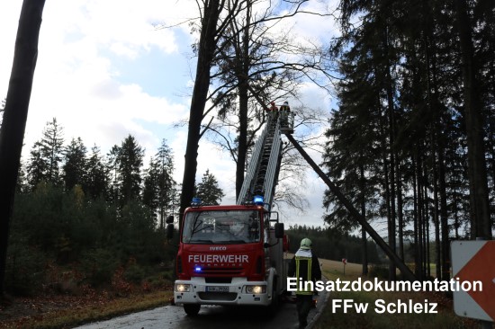 ausgelösten Brandmeldeanlage auf Schloß Burgk nachgehen mussten. Auf der Ortsverbindungsstraße hatte "Herwart" fünf Bäume zu Fall gebracht. ein sechster Baum musste "Notgefällt" werden, weil er schon durch extremer Schräglage die Einsatzkräfte bei ihrer eh schon gefährlichen Arbeit bedrohte. |