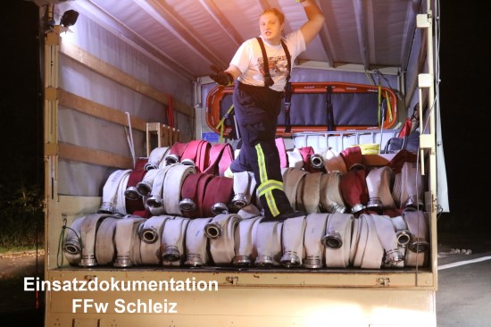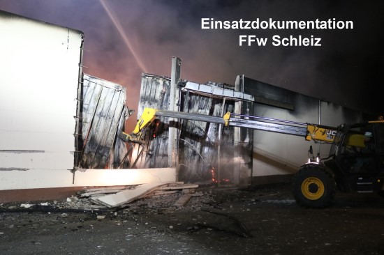 keine Chance, nur ein einziges Kalb zu retten. Als die um 19:53 Uhr alarmierten Kräfte am Einsatzort Ortsausgang Schöndorf ankamen, stand die rund 50 Meter lange und 20 Meter breite Halle schon in Vollbrand. Bis in die frühen Morgenstunden kämpften die Feuerwehren gegen die Flammen und konnten alle angrenzenden Stallanlagen schützen. Schon auf der Anfahrt bei Neundorf waren die in den Nachthimmel lodernden meterhohen Flammen zu sehen. Die bereits vor den Schleizer Einsatzkräften angerückten Einsatzkräfte aus Schöndorf übergaben auf Grund der Größe des Ereignisses umgehend die Einsatzleitung an den Schleizer Stadtbrandmeister. Als zunächst schwierig erwies sich die Löschwasserversorgung. Zur Verfügung standen eine kleine Löschwasserzisterne im Agrarbetrieb, ein kleiner Teich hinter dem Gelände des Unternehmens und ein ca. 750 Meter entfernter größerer Teich am tiefsten Punkt des bergigen Ortes Schöndorf. Dort war das LF 16-TS aus Schleiz zur Löschwasserversorgung in Stellung gegangen. Nach ca. 350 Meter Entfernung und einem Höhenunterschied von ca. 40 Meter, wurde die Doppel-B-Leitung im Ort mit je einer Tragkraftspritze aus den beteiligten Feuerwehren - teilweise im Ersatzaustausch - verstärkt. Ca. 800.000 Liter Wasser konnten somit in den folgenden Stunden allein aus dem Teich im Ort zum Einsatzort gefördert werden. Insgesamt kamen ca. 2,5 Kilometer B- Schläuche (a. 20 Meter) zum Einsatz. 800 Liter Löschschaummittel wurden dem Löschwasser in Konzentrationen zwischen 0,2 und 3 Prozent zugemischt. Im Einsatz waren 3 Einsatzkameradinnen und 69 Einsatzkameraden der sechs Feuerwehren, eine Rettungswagenbesatzung des DRK in Schleiz, ein Fahrzeug der Johanniter aus Neustadt (Katastrophenschutz mit drei Kameraden), zwei Besatzungen der Polizei in Schleiz und viele tatkräftige Helferinnen und Helfer des Agrarbetriebes. Der Einsatzleiter entschied auf Grund der anfangs noch nicht zur Verfügung stehenden Löschwassermengen die Halle (kombinierter Bergeraum und Kälberstall) zunächst nur am kritischsten Punkt über die Drehleiter zu löschen und alle anderen Vorräte an Material und Wasser zum aktiven Schutz der akut bedrohten Hauptstall- und Milchviehanlage zurückzuhalten. Währenddessen wurde fieberhaft durch viele Einsatzkräfte am Aufbau der langen Wasserförderstrecken gearbeitet. Mit einem Teleskoplader wurde nach Herstellung einer stabilen Löschbereitschaft die Halle von der Hauptstallseite her eingerissen und dann die großen Dachbleche beseitigt. Gegen 22:30 Uhr begann die aufwendige Bergung des tonnenweise eingelagerten Strohs, jenes so gut wie möglich abgelöscht auf eine Wiese transportiert wurde. Inklusive Abbau der Löschwasserleitung dauerte diese Bergung alleine fast 7 Stunden. Dabei waren die beiden Teleskoplader der Agrargenossenschaft und mehrere Traktoren mit Anhänger pausenlos unterwegs. Ebenfalls pausenlos wurde das brennende Stroh am Einsatzort über die Schleizer Drehleiter und am Ablageort durch mehrere Strahlrohre der Feuerwehren Schöndorf und Volkmansdorf mit Löschwasser beaufschlagt. Kurz nach sechs Uhr waren die Einsatzkräfte aus Schleiz wieder am Standort und begannen mit der Wiederherstellung der Einsatzbereitschaft. Mitten in den Arbeiten schrillten erneut die Alarmmeldeempfänger... ein Unfall auf der A9 war das nachste Ziel. Somit war dann der Gesamteinsatz nach 14 Stunden beendet und die Nacht schon lange vorbei. Was bleibt sind neben erheblichen Schäden, dessen Ursache noch völlig unbekannt ist, die Tatsache, dass rund 70 Kälber von Beginn an nicht gerettet werden konnten. Bei der Entdeckung des Brandes war durch die Mitarbeiter des Agrarbetriebes gab es schon keine Möglichkeit mehr, nur ein einiges Tier zu retten. Die Nacharbeiten zum Brand für die Reinigung von Bekleidung, der Atemschutztechnik und der Schläuche werden die Einsatzkräfte und vor allem der Gerätewart aus Schleiz noch reichlich 14 Tage benötigen. Die Einsatzführung bedankt sich bei allen schon erwähnten Einsatzkräften für eine tadellose und beispielhafte Zusammenarbeit. Ein besonderer Dank gilt auch den Mitarbeitern des Agrarunternehmens für die gute Versorgung und gute Zusammenarbeit bei der Erfüllung der Aufgaben. Ein weiter Dank gilt auch den Mitarbeitern der Rettungsleitstelle in Saalfeld sowie der Polizei. |