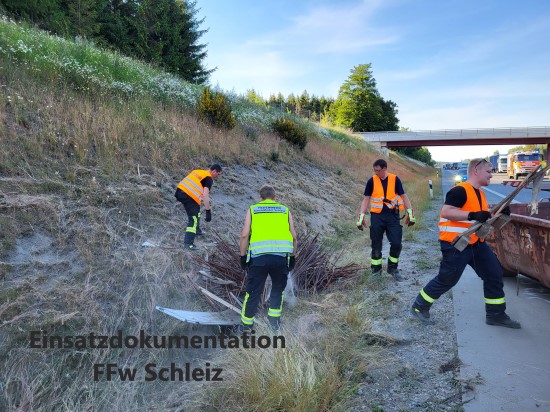 am 15.06.2022 ab 16:42 Uhr auf die Beine zu stellen hatten. Nach einem Reifenplatzer war zuvor ein mit 6 Bauarbeitern besetzter Transporter ins Schleudern geraten und überschlug sich anschließend. Alle Personen an Bord wurden dabei schwerverletzt und mussten nahezu gleichzeitig versorgt werden. Letztlich alarmierten die Mitarbeiter der Rettungsleitstelle nach Anforderung des Organisatorischen Leiters des Rettungsdienstes 6 Rettungswagen, 2 Notarztwagen und 2 Rettungshubschrauber zum Einsatzort. Auch die Kameraden der Schleizer Feuerwehr wurden zum Unfallort alarmiert und unterstützen aktiv die Rettungsarbeiten, nachdem sie den Fahrzeugverkehr auf der Bundesautobahn mit taktischer Verkehrsmitführung zum Stillstand gebracht hatten. Die Rettungswagen kamen zum großen Teil aus umliegenden Wachen und aus dem Saale-Holzland-Kreis. Taktisch klug wurde darauf geachtet, dass trotz des größeren Bedarfs an Rettungsmitteln noch zwei Rettungswagen (Bad Lobenstein und Pößneck) für den restlichen Landkreis für andere Notfälle zu Verfügung stand. Die Rettungshubschrauber waren von Leipzig und Zwickau direkt zur Unfallstelle geflogen. Deshalb musste die Bundesautobahn für ca. zwei Stunden voll gesperrt werden. Schnell staute sich der Verkehr bis zur Anschlussstelle Triptis zurück. Vieler Autofahrer wählten somit als Umleitung den Weg durch die Schleizer Innenstadt. Die Autobahnpolizei hatte inzwischen die Ermittlung zur Unfallursache begonnen. Offenbar war der hintere linke Reifen bei voller Fahrt geplatzt. Zunächst musste erneut zur Kenntnis genommen werden, dass wieder einmal ein mit Winterrädern besetztes Fahrzeug bei Sommertemperaturen mit einem Reifenplatzer zu kämpfen hatte. Nach dem Abtransport der Verletzten ín die Kliniken Schleiz, Gera und Jena galt es, schnellstmöglich die Unfallstelle zu räumen. Dazu zogen die Einsatzkräfte den Transporter auf die Seite, um anschließend die Fahrbahnen zu säubern. Zunächst die dritte Fahrspur gereinigt und abgesichert, um schnellstmöglich den Verkehr wieder ins Rollen zu bringen. Auch bei der Bergung der Ladung, bestehend aus Bewehrungsstahl, halfen die Einsatzkräfte der Schleizer Feuerwehr mit. Zu bemerken ist hierbei einmal, dass auch die Räumung der Unfallstelle zur Gefahrenabwehr gehört und daher auch die Zuhilfenahme der Technik der Feuerwehr durchaus vertretbar ist. Durch die mit der Polizei und der Einsatzleitung festgelegten Maßnahmen konnten auch in der Vergangenheit schneller Gefahren beseitigt und vor allem auch die teilweise kilometerlangen Staus schneller beseitigt werden. Wir danken allen Ersthelfern und beteiligten Einsatzkräften von DRK, Polizei, den Besatzungen der beiden Rettungshubschrauber, den Notärzten und den Mitarbeitern der Rettungsleitstelle Gera für die gute Zusammenarbeit. Die sechs Verletzten wünschen wir schnellste Genesung. |