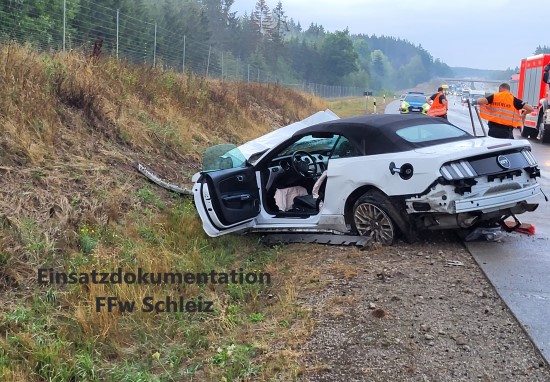 | Diesmal war es Starkregen. Ein weiterer Ford Mustang war aus bisher ungeklärter Ursache am Kilometer 218,5 Richtung Nürnberg nach rechts von der Fahrbahn abgekommen, fuhr nach rechts in den Hang und überschlug sich anschließend. Fahrer und Beifahrer mussten verletzt ins Klinikum gebracht werden. Die Einsatzkräfte der Feuerwehr sicherten gemeinsam mit der Autobahnpolizei die Unfallstelle und beseitigten weit verstreute Fahrzeugteile. | |