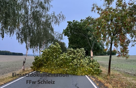 | Nach einem Blitzschlag war ein Baum zwischen den Orten Neundorf und Volkmannsdorf auf die Straße gekracht und versperrte diese. Die Besatzung des TLF 4000 übernahm die Aufgabe zur Beseitigung der Straßensperre. | |