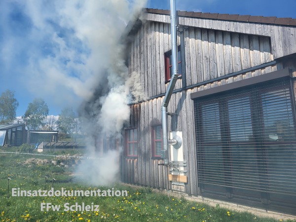 Totalverlust des Gebäudes nicht verhindern. Am 23.04.2024 um 14:32 Uhr wurden die Einsatzkräfte aus den Orten Külmla, Schöndorf, Ziegenrück, Knau, Bucha, Posen und Schleiz zum ersten Mal alarmiert. Ein Teil der Außenfassade war zuvor aus bisher unbekannter Ursache in Brand geraten und hatte offenbar reichlich Zeit für eine Brandausbreitung. Das "Musterhaus" war als Holzhaus gebaut eine wahre Herausforderung für die Einsatzkräfte. Die doppelte äußere Holzverkleidung konnte, nicht wie meist üblich, mittels Reißhaken oder Brechwerkzeug demontiert werden. Nahezu jede Schraube der festverschraubten Bretter musste einzeln mittels Akkuschrauber entfernt werden. Das war am Ende nicht nur ein weiterer Zeitverlust, sondern ermöglichte somit die fortschreitende Brandausbreitung Schlussendlich mussten die Einsatzkräfte den Dachstuhl innen und außen teilweise öffnen, um die sich immer weiter vorfressenden Flammen zu stoppen. Über Stunden suchten die Einsatzkräfte mit Hilfe von Wärmekameras Brandnester, die sich in den Isolierstoffen der Wand und Dachverkleidungen befanden. Sie löschten die Flammen komplett ab. Das nötige Löschwasser wurde von einem rund 500 Meter entfernten Teich gefördert. Um 20:35 Uhr rückten die letzten Einsatzfahrzeuge der Schleizer Feuerwehr vom Einsatzort ab. Bis 22:00 Uhr hatten die Kameradinnen und Kameraden zu tun, bis die Einsatztechnik wieder gereinigt und einsatzbreit war. Kurz zuvor waren schon die anderen Feuerwehr im ersten Abmarsch von der Rettungsleitstelle Gera alarmiert worden. Als die Einsatzkräfte in Külmla ankamen, war der Brand soweit fortgeschritten, dass das Gebäude als verloren eingestuft werden musste. Selbst in einem zunächst noch nicht direkt betroffenen Gebäudeteil herrschten Temperaturen von über 600°C. Wie es zum ersten Brand und dann später zum weiteren vollumfänglichen Brand kommen konnte, ermitteln nun die Spezialisten der Kriminalpolizei. Nach Sonnenaufgang war der Brand gelöscht und die Einsatzkräfte rückten wieder zu ihrem Standort ab. Dann begann für die Kameradinnen und Kameraden ein umfangreiches Programm zur Wiederherstellung der Einsatzbereitschaft, was gegen 10:30 Uhr beendet werden konnte. Die technische Aufbereitung wird noch einige Tage in Anspruch nehmen. |